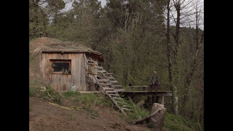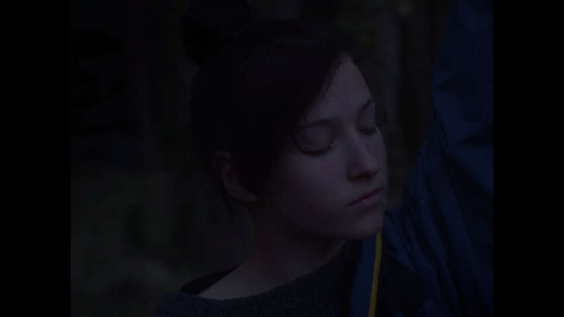 Le lieu Nous sommes derrière l’œillère de la porte de la cabane, nous voyons l’homme s’approcher. Tout au long du film nous serons immergés avec lui et elle, cette jeune femme Mana, qui l’accompagne dans les bois de la Lozère. Nous n’emmenons rien avec nous, nous sommes débarrassés. Faire lieu, c’est forcément un acte d’immersion, c’est perdre l’espace, retrouver l’inévidence, ne plus savoir ce qui fait forme, ce qui fait signe. Notre point de vue ne se pose pas sur le monde, C’est un point de vue dans le monde, que nous propose la réalisatrice. De cette immersion naît un sentiment d’immanence, sans symboles. Nous ne regardons pas le film, nous sommes avec les deux personnes, nous sommes avec les arbres, les bruissements, les sons. Ces relations d’immanence, ne s’élèvent pas, elles s’entretiennent, elles tentent plutôt à se resserrer, à faire corps commun.