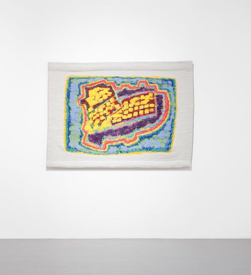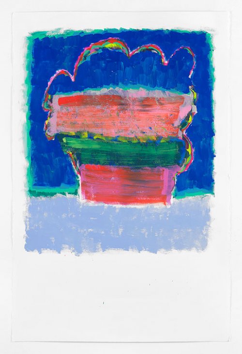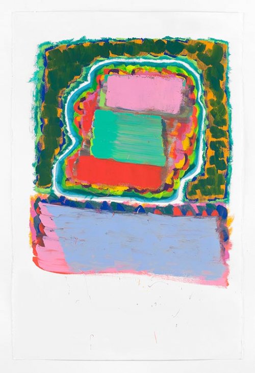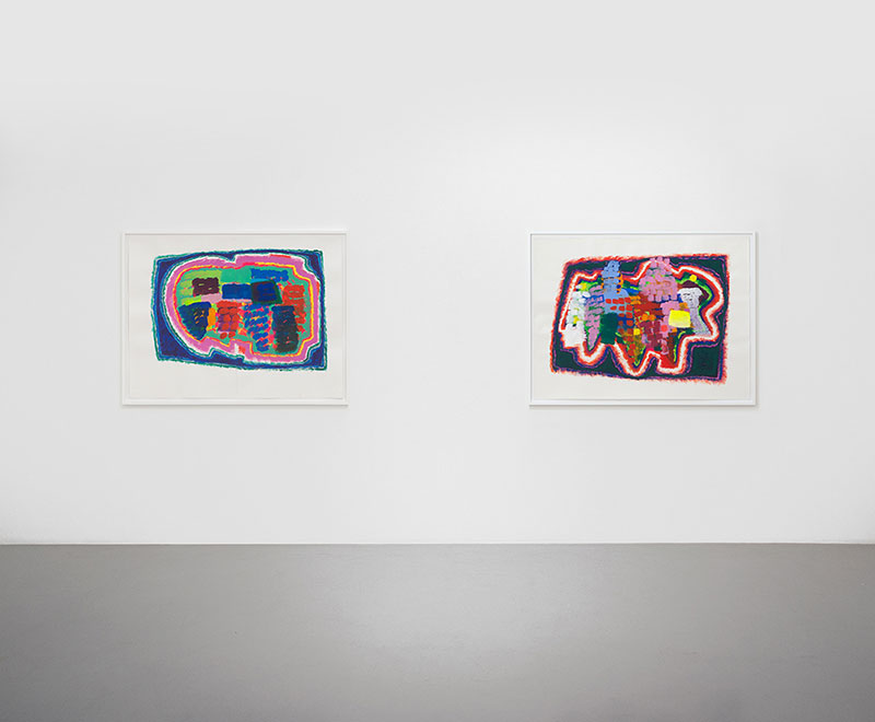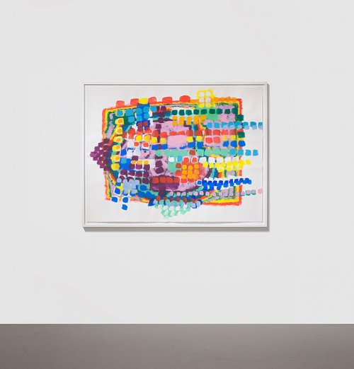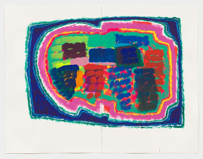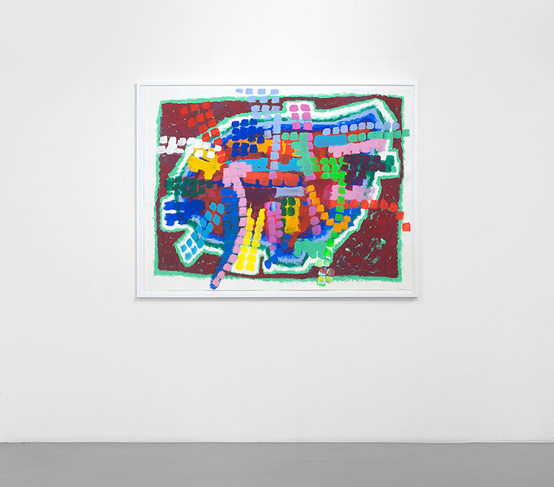 Que voit-on en effet sur la plupart de ces gouaches ? Des formes nettement dessinées, qui peuvent évoquer les murs d’une ville, les murs qui entourent un grand château, bref un territoire mais qui n’est pas mis en scène avec le sérieux que l’on devrait avoir si l’on voulait en représenter un. Ces dessins sont donc des zones de peinture dont la fonction est manifestement d’accueillir des éléments qui ne sont, eux, rien d’autre que des coups de pinceaux posés côte à côte comme on martèlerait une surface avec un marteau. Ces coups de pinceaux forment de petites séries, des ensembles instables de couleur qui recouvrent de probables tentatives antérieures de remplir l’espace que le dessin a fait naître.