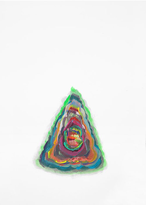 Ce jeu de superpositions conduit d’une part à l’émergence de densités variables contenues dans l’espace délimité de la forme et d’autre part il peut donner lieu à des dépassements, des sorties picturales du pinceau qui semble être parti faire un tour en dehors de la limite. Ces lignes de fuite indiquent qu’ici la force d’une couleur a en quelque sorte imposé sa loi et dépassé les bornes.