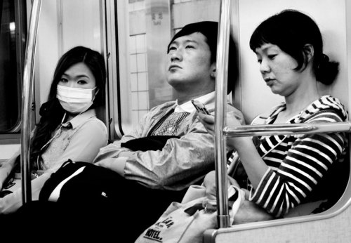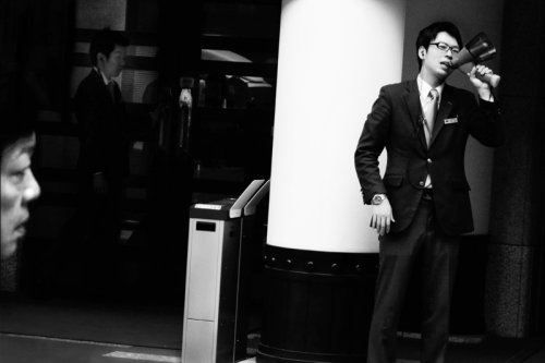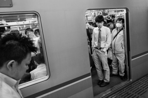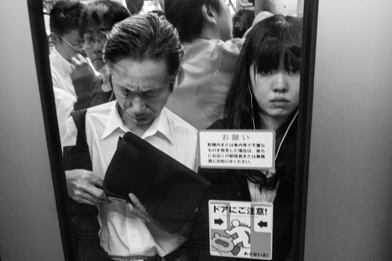 Les passagers sont endormis, ils tombent littéralement de fatigue. La photo témoigne de l’extrême épuisement des cadres japonais. Le photographe se fait discret. Il photographie les passagers en évitant tout contact comme s’il n’était pas là. Seul compte la qualité de son regard posé sur la scène.