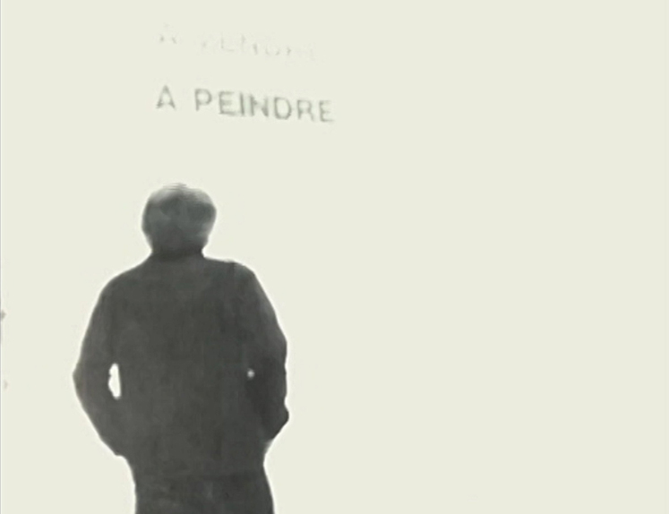 Tout est blanc. L’affiche a perdu ses contours. Le muret a disparu. Il reste un corps de dos, des mains blanches, un geste simple, prendre quelque chose dans la poche arrière et un autre geste presque anodin, dont nous savons ce qu’il est sans pouvoir voir qu’il est bien cela, celui de la dépose de l’empreinte sur le bord du muret. Mur blanc, lettres à demi mangées par la lumière, les deux seuls mots qui restent dans la surexposition de l’image À PEINDRE résonnent comme une annonce, un projet, une invitation. Mais la main qui s’avance se fait dévorer par le blanc et l’empreinte déposée semble n’avoir jamais existé. Il n’y a rien que la lumière, l’aveuglement solaire, l’effacement des formes. Et resplendit dans cet instant de vacuité presque pure l’essence de ce geste dont la puissance tient à ce qu’il nous revoie à nos illusions fatales relatives à la signification des choses, des hommes, du monde.