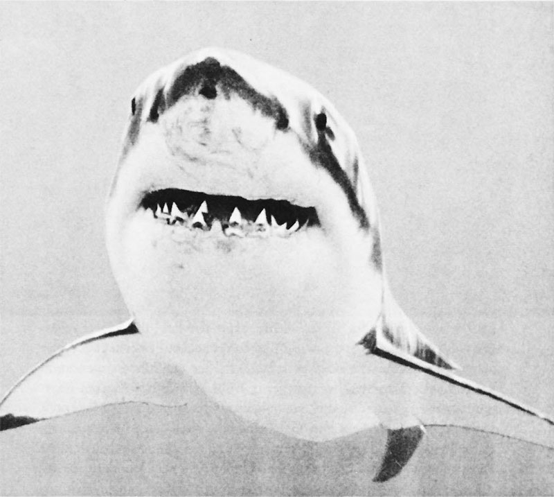 À peine le plongeur de Kluge pourrait-il dire, tels les fugitifs des Desastres de la guerra de Goya, « Yo lo vi ». C’est à travers les quatre images-commentaires de l’histoire, requin bleu et requin grimpeur que l’ombre de l’animal-poisson, Fischtier, prend nom et corps iconiques [5] : ailerons surexposés, bouche béante sur un dispositif métallique en croix, peau qui s’imprime en une multitude de dents se semant d’elles-mêmes sans nul Cadmos, face humaine riant de toutes ses dents mais barrée à l’instar de la gueule du requin, face à deux yeux sans visage, grand ouverts. La gueule mythique, tératologique, grotesque s’arrache au « temps aux lèvres de lime » en une « seconde épiphanie de l’animalité ».