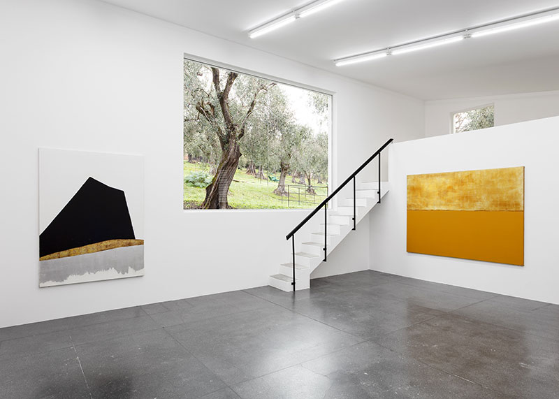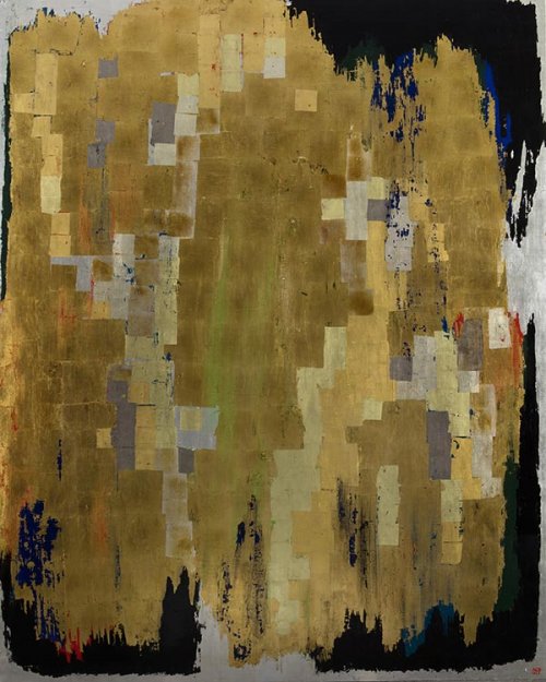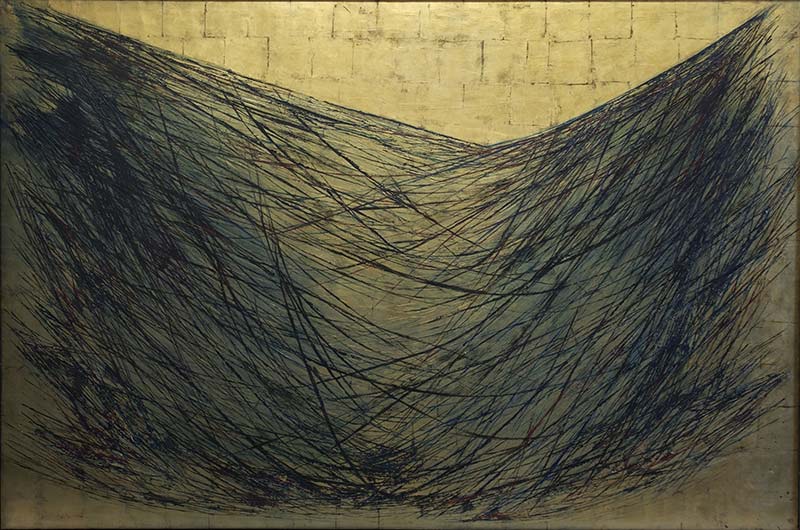 L’exposition a lieu dans les ateliers du couple d’artistes. Ces grands espaces, exposés plein nord, offrent une lumière continue, diffuse et homogène aux tableaux et dessins présentés. Autant de lumière naturelle pour la contemplation de tableaux est un luxe, car cela nous permet de saisir pleinement les couleurs et les sentiments exprimés dans les toiles. En effet, la lumière est une thématique centrale du travail de Bergman. En plus du choix de la ville d’Antibes, l’orientation des fenêtres de son atelier n’est pas une décision anodine, elle lui permettait d’avoir accès à tous types de luminosités et de couleurs tout au long de la journée. Cette fascination pour la lumière se retrouve aussi dans les techniques utilisées : le travail du métal, que ce soit à la feuille d’or, d’argent, de cuivre ou encore d’aluminium, a eu pour vocation d’exploiter au maximum la luminosité naturelle. Inspirée des grands peintres de la Renaissance et des artistes viennois tels que Klimt, Bergman va se former au travail de la feuille métallique, puis va progressivement s’éloigner du traditionalisme de la dorure pour venir peindre, gratter, frotter, superposer les mediums et ainsi laisser apparaître la sous-couche de couleur mélangée aux reflets métalliques. De cette façon, chaque tableau est un monde en soi, concept qu’elle appelle un « perpetuum mobile ». Le spectateur tourne autour de la toile comme s’il cherchait à découvrir tous les aspects d’un monde, toutes les facettes du tableau. Le mouvement, mais aussi le changement d’éclairage naturel ou artificiel, nous permet d’appréhender les reflets, les variations de lumières, de couleurs, le volume et la texture du métal gratté et déformé. Le changement d’atelier de Paris à Antibes conduit justement Bergman à libérer sa pratique, le gain de place lui laissant l’opportunité de s’essayer au grand format.