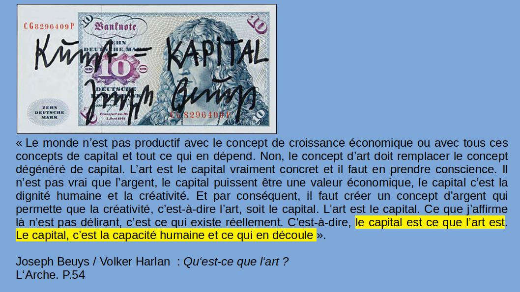 « L’élargissement de l’art comme processus d’individuation psychosociale en lutte contre la perte de participation est l’apport encore mécompris, particulièrement en France, de l’œuvre de Joseph Beuys » (Bernard Stiegler : De la misère symbolique 2. p.175)