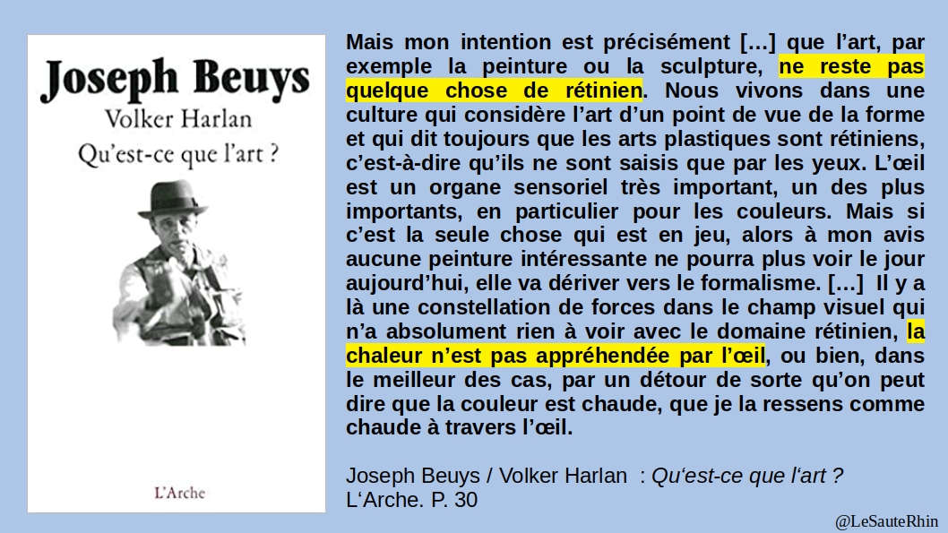 J’ai souligné ce à partir de. Il n’est pas question de partir avec mais de bourlinguer à partir de Andy Warhol et Joseph Beuys, deux artistes du 20e siècle. Il nous invite à une prise de risque devant la complexité de la tâche dans la « guerre esthétique » qui se présente à nous.