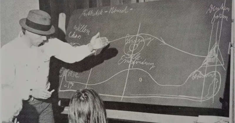 Le dessin réalisé au cours d’une conférence à la Volkshochschule de Remscheid, n’est pas sans évoquer avec ses différences le schéma de Paul Klee évoqué dans la précédente chronique. L’instantané photographique donne une forte idée du gestus pédagogique, du mouvement du corps, du bras, de la main qui partent de mots tels que, à gauche, volonté, chaos, énergie vers, à droite, pensée, forme, en passant par mouvement, âme, sentience [Empfindung]. Il manque bien entendu la parole. Beuys « sculptait » aussi avec sa langue.