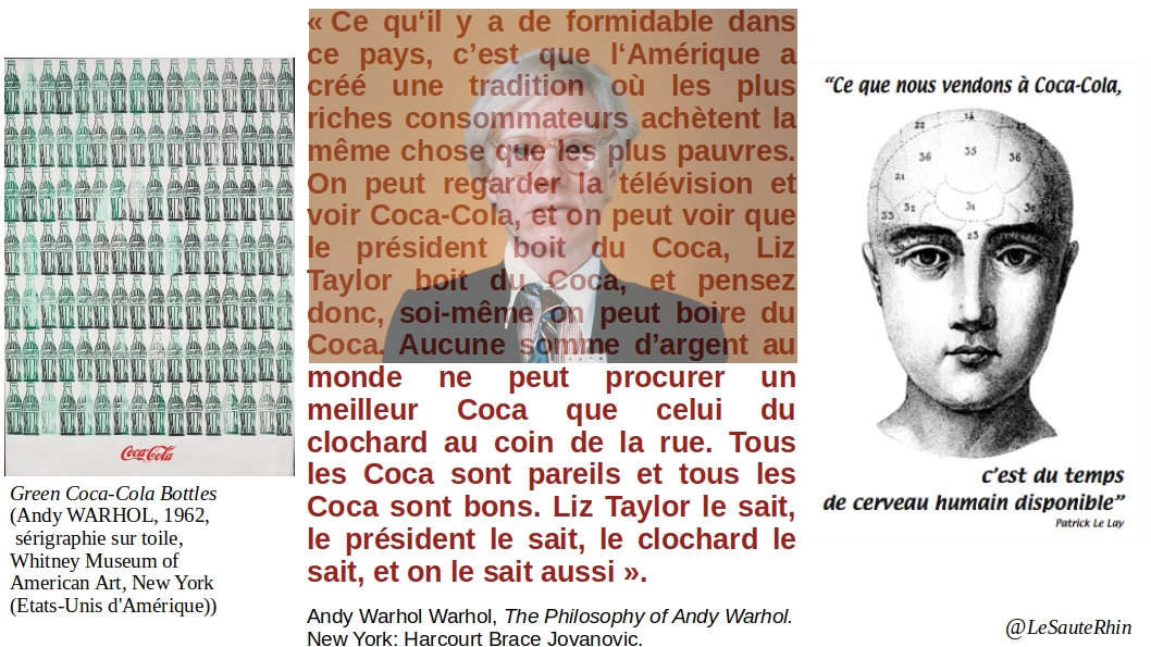 Les deux textes, celui de Warhol et de Patrick Lelay, sont cités par Bernard Stiegler en exergue du chapitre mentionné. Par ailleurs, Warhol a inventé l’expression « 15 minutes of fame » (15 minutes de gloire), qui se rapporte à l’état passager de la célébrité fabriquée. Comme dans les émission de téléréalité.