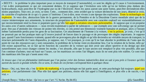 Dans un entretien avec Volker Harlan, à la fois morphobiologiste et historien de l’art, paru en 1986, Beuys articule à propos de l’automobile la question de l’esthétique avec celle de l’énergie physique, en l’occurrence de source fossile et polluante,et de l’énergie psychique en abordant la question du capitalisme devenu pulsionnel, autant dire a-social.