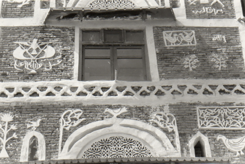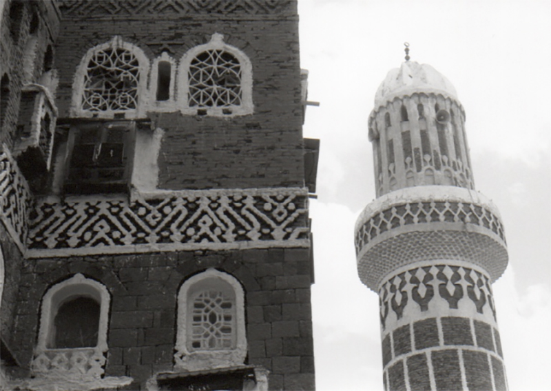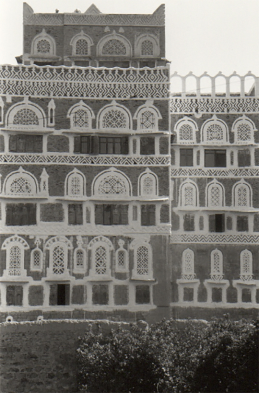 Sanaa ! Sanaa « capitale du monde » proclamait dans un transport déraisonnable, il y a bien longtemps, un grand amoureux du Yémen, mais que pourrait bien être un amour raisonnablement transporté ? De jour, Sanaa se présentait comme un invraisemblable labyrinthe fait d’argile et de poussière, avenues ou rues en attente permanente d’asphalte sur lesquelles circulaient à toute vitesse motos et véhicules hétéroclites soulevant un nuage épais voilant cette belle lumière, et puis soudain, à l’angle de deux ruelles, bizarre apparition, comme de très gros blocs de pain d’épices décorés de filets de sucre glace. Voisinage vraiment étrange que celui de ce chantier interminable et des délicieuses pâtisseries architecturales que sont les belles maisons de Sanaa. Hautes façades de briques brunes, quatre ou cinq étages, parfois plus, sur socle de basalte et soubassement de pierres, encadrements des fenêtres étroites ornés de motifs en plâtre et de dessins à la chaux, signalétique religieuse ou corporatiste prétexte à riches décorations, vitres d’albâtre translucide ou vitraux multicolores pour diffuser la lumière à l’intérieur.