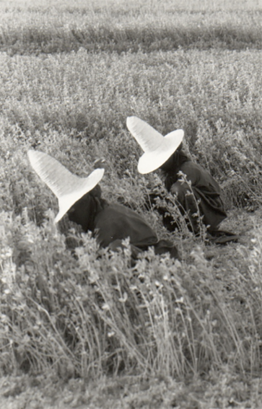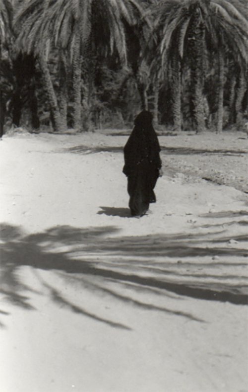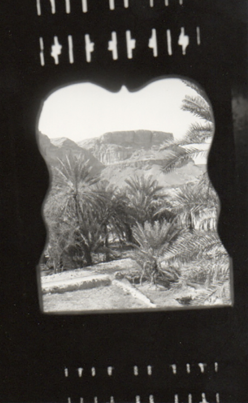 Et puis un long couloir, une vallée étroite encadrée de falaises abruptes, de la végétation en bouquet, des palmiers courts en boule dominés par la stature élancée des dattiers, d’autres arbres bas aussi, éventail de verts nuancés, des champs de mil d’où émergeaient les pointes de chapeaux comme ceux des sorcières de nos vieux contes, chapeaux de paille à large bord mais extrêmement pointus sur le dessus, formes noires de femmes affairées au travail de désherbage des plantations, autres fantômes noirs surgis d’on ne sait trop quel bosquet de palmes derrière un maigre troupeau de chèvres, encore de ces surprenantes sorcières ponctuant le paysage ici ou là, suspendant leurs gestes, d’étonnement devant notre présence, ou ne nous remarquant pas trop occupées qu’elles étaient par leurs tâches, ce qui était bien mieux ainsi, car il est bon de se fondre dans les paysages, de se faire oublier dans l’ombre d’un muret ou de se noyer dans le feuillage d’un arbre bas, comme je l’ai déjà dit.