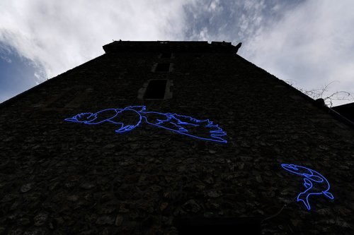 PP : La première œuvre présentée sur le donjon du château est très belle avec ce dessin de l’aigle de cinq mètres d’envergure tracé au néon bleu associé à un poisson qui semble tomber ou fondre du ciel. Il nous renvoie à la légende fondatrice de Lourdes, mais pas seulement ?