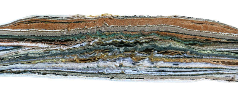 Papier d’œuvres vives se plie, s’étend, se fend, s’incise, se torture, se dilate, s’écrit, s’encre, se confond, se nourrit, se pigmente, s’enveloppe, se voile. S’encielle et s’offre en atout majeur d’art supposé mineur.