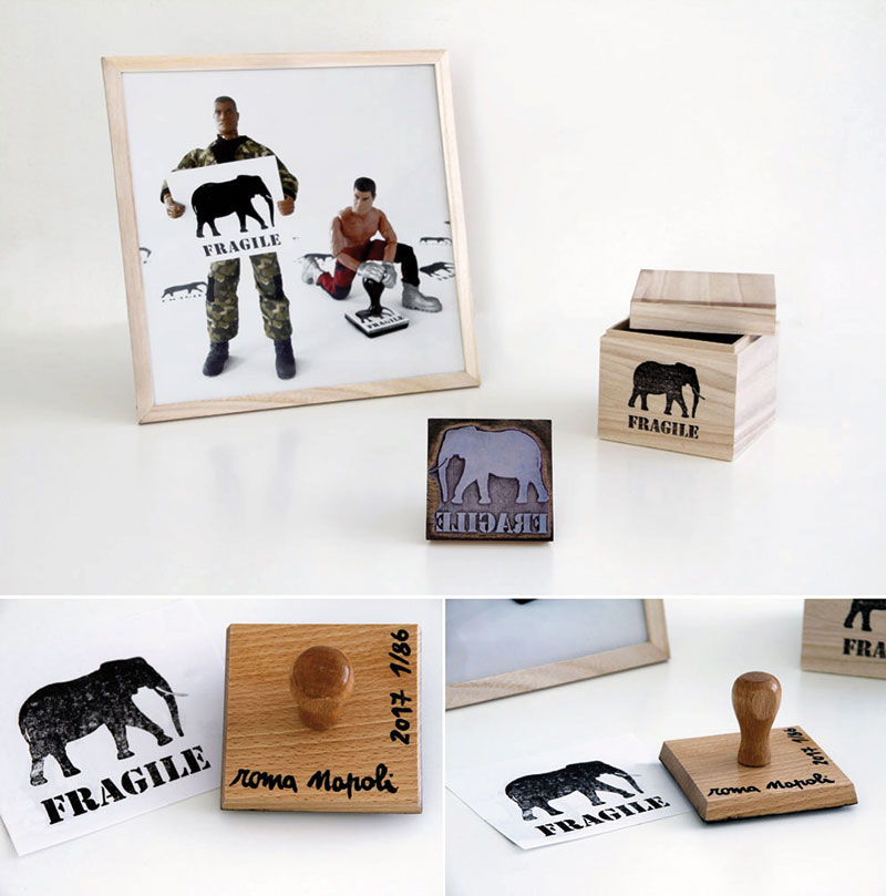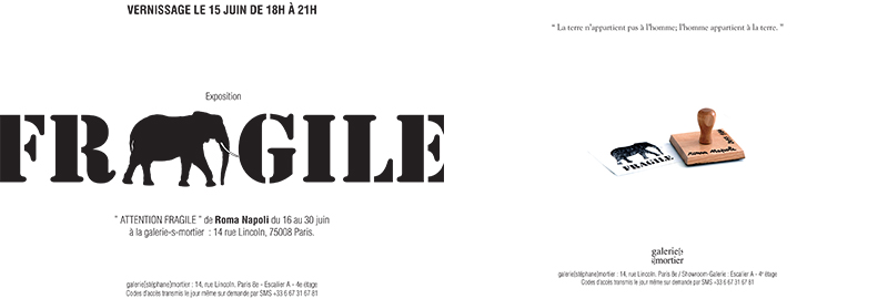 Elle imagine pour le réaliser un tampon où l’on peut lire FRAGILE sous l’idéogramme d’un éléphant. Antonyme qui inscrit la fragilité de ce mastodonte face à un prédateur tel que l’homme et dont la disparition tire une fois de plus, la sonnette d’alarme en regard de notre incapacité collective à préserver notre écosystème et à agir alors qu’il est déjà presque trop tard.