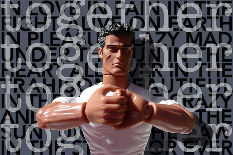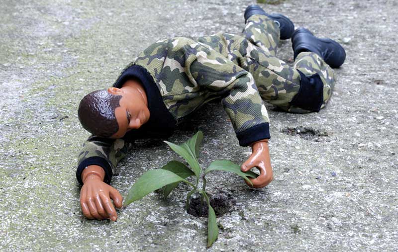 Les créations de Roma Napoli, qu’elle nomme à bon escient Tableaux photographiques se placent naturellement dans cette pratique. Par la mise en situation décalée des figurines Action Man et apparentés, elle transgresse avec humour et perspicacité la violence virile attachée à ces jouets guerriers dédiés aux enfants. La mise en situation dans l’espace poétique de ces représentations musclées en plastique s’accompagne d’une mixité de référents littéraires, philosophiques, anthropologiques, sociologiques et artistiques et parfois l’extrême tension jouxte une ironie décalée à la manière de GG Ballard.