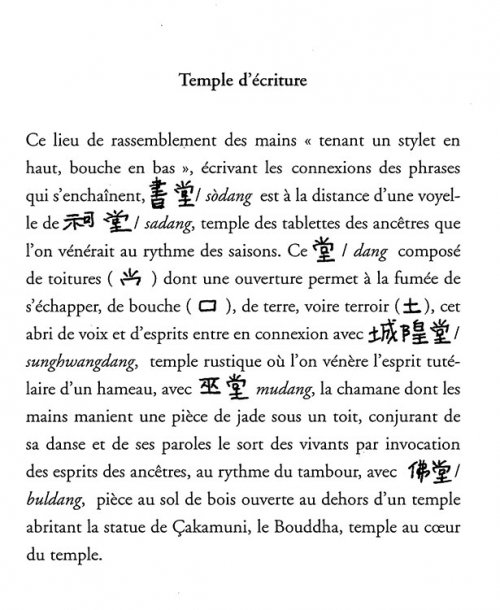 Le coréen ignore le genre. Le masculin et le féminin se sont avérés une aventure inouïe. Le masculin et le féminin, n’était-ce pas quelque chose comme le yang ou le yin, le Mont du Sud et le Mont du Nord qui s’ébattent au gré de la lumière et de l’ombre ? J’étais désemparée par l’omniprésence du pluriel et du pronom personnel, par la conjugaison des verbes, par l’indicible jeu de l’article, le défini, l’indéfini et le partitif, par la variété des ponctuations, par la multiplicité des temps verbaux. En coréen, le pronom personnel s’éclipse, il se laisse deviner par une présence implicite, une sorte de forme vide que chaque locuteur s’approprie. Le sidjo ancien à la verticale ou le poème moderne à l’horizontale sans ponctuation se laissent suspendre dans le vide. La courtisane du XVIe siècle sous la dynastie des Yi, Hwang Jin I, exprimait la fuite du temps à travers les verbes surcomposés – u lô yè ô ga neun go – verbe triple : ul da, pleurer, yè da, en écho, ga da, s’en aller – par le suffixe terminal à nuance négative, interrogative, impérative, dubitative. Sans se dérober, sans se laisser deviner, le « mon » souverain s’appelle « mont », appelle le bien-aimé :
