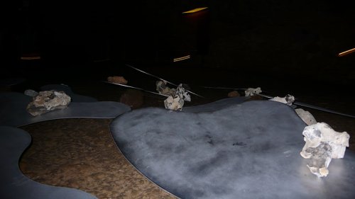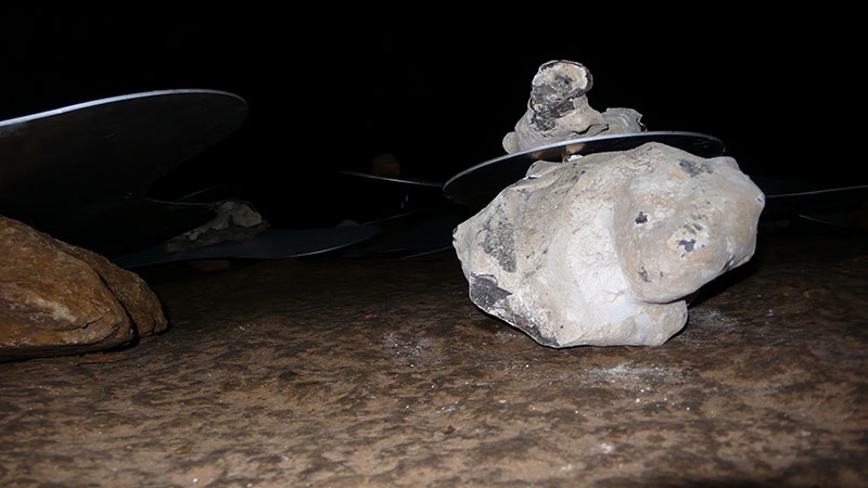 B : Pour moi ce qui fait lien entre la préhistoire et l’espace c’est notamment cette question de l’outillage. Je trouve que l’archéologie et le futur font partie du même temps. N’oublions pas qu’il y a une archéologie de l’espace qui va chercher les débuts de la création de l’univers. A ce niveau il n’y a plus de notion séparation entre passé, présent, futur. Tout est en symbiose. Nous sommes des êtres qui construisons une histoire, certes. Mais cela ne représente qu’une fraction de seconde dans le temps cosmique. Dans mon travail il y a toujours eu cette double présence de la préhistoire et de l’espace. En fait du terrestre et du céleste. Il faut déjà comprendre sur quel support nous sommes et nous marchons. Le vaisseau terre en l’occurrence. Mais la terre et l’espace font partie pour moi d’un ensemble global. Ce qui est particulier avec la proposition pour le Mas d’Azil, c’est que je la considère comme une pile qui se charge et se décharge. Comme une pile naturelle mobile.