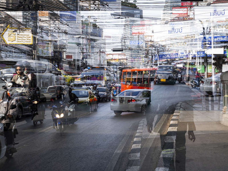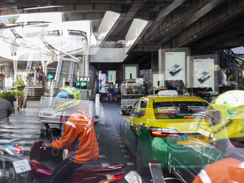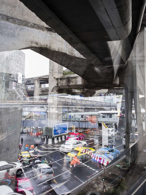 Un horizon bouché. Un béton omniprésent. Un ciel, gris de pollution. Des immeubles, des chantiers, des échoppes en tous sens. Des bus, des voitures, des scooters, encore des bus, des voitures, des scooters. Sans oublier l’omniprésence du métro aérien et de ses viaducs. Et puis les gens. Beaucoup de gens : à la queu-leu-leu sur les innombrables passerelles piétonnes surplombant la rue, à quatre sur les motos, bloqués jour et nuit dans les embouteillages. A Bangkok, tous les éléments qui constituent une ville sont empilés sur plusieurs hauteurs. La première impression est celle d’étouffement, d’écrasement.