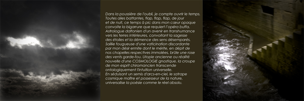 Salmigondis embrasé par une volupté immatérielle, mes pensées, insultes extravagantes, sont tissées par des araignées magiques.