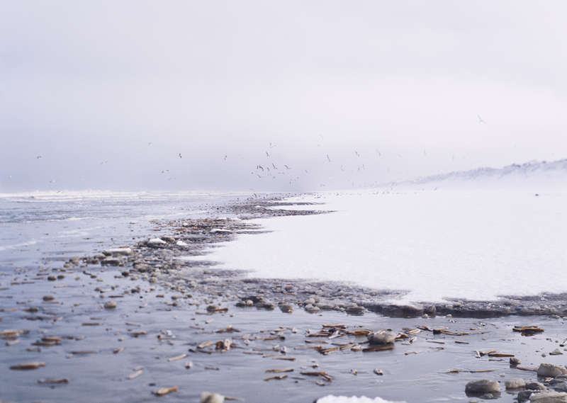 Dans l’effet de bord propre au littoral, le photographe prend le risque d’un entre-deux ; il n’est plus dans l’enceinte des terres, au mitan ou au milieu d’une géographie, au sein ou au centre de la demeure ; il pose pied sur le rivage, cette frange qui borde la mer et qui voisine avec la distance illimitée, avec l’extériorité. Finis terrae. Ici finissent les terres, c’est le bout du chemin ! Aux extrémités correspondent souvent l’imminence d’un événement, la promesse (ou la menace) d’un dépassement ou d’un accomplissement — et le tremblement qui en résulte dans la psyché… Aux abords de l’île frisonne d’Ameland prévalent silence, dépouillement et dépaysement (au sens de sortie hors du petit pays en direction de la mer, de changement de milieu, de passage) ; mais le punctum [1] de la photographie existe bel et bien, qui conduit les regards jusqu’à l’envol des oiseaux vers la nue.