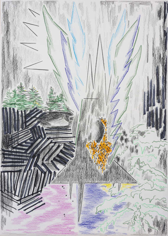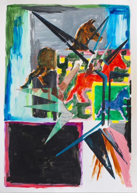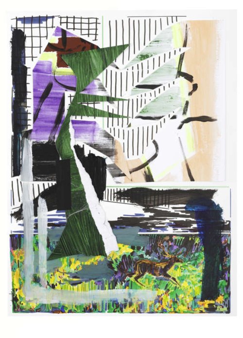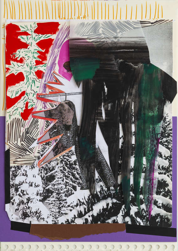— Sur le papier tu utilises le collage, le crayon, la peinture : comment ces différents outils se combinent-ils ? Pour quelle raison utilises-tu l’un, puis l’autre ? Que cherches-tu ainsi à rendre ?