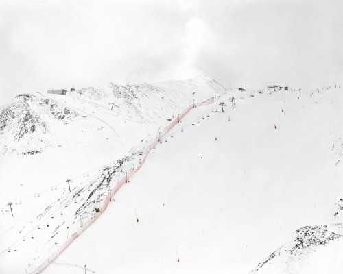 C’est donc cela le monde ? Ces valeurs plastiques qui effacent la perspective et jouent des variations infinies du blanc de la neige et des nuages tout en permettant l’observation, de près, du moindre détail. Et cette oblique rouge, qui pourrait être du pinceau d’un vieux maître chinois, est en réalité le filet de protection d’une société obsédée de sécurité.