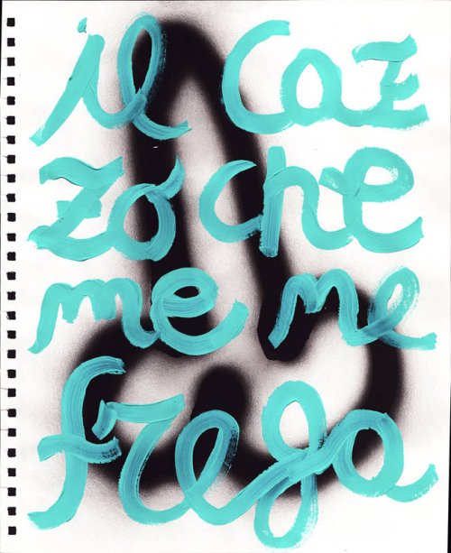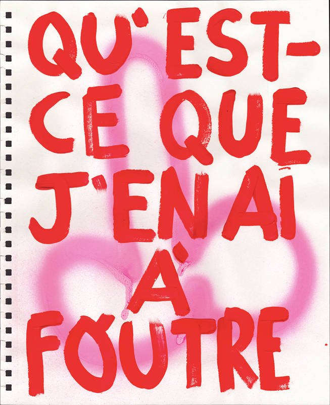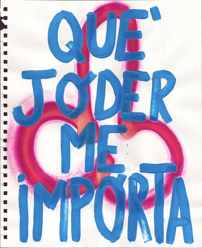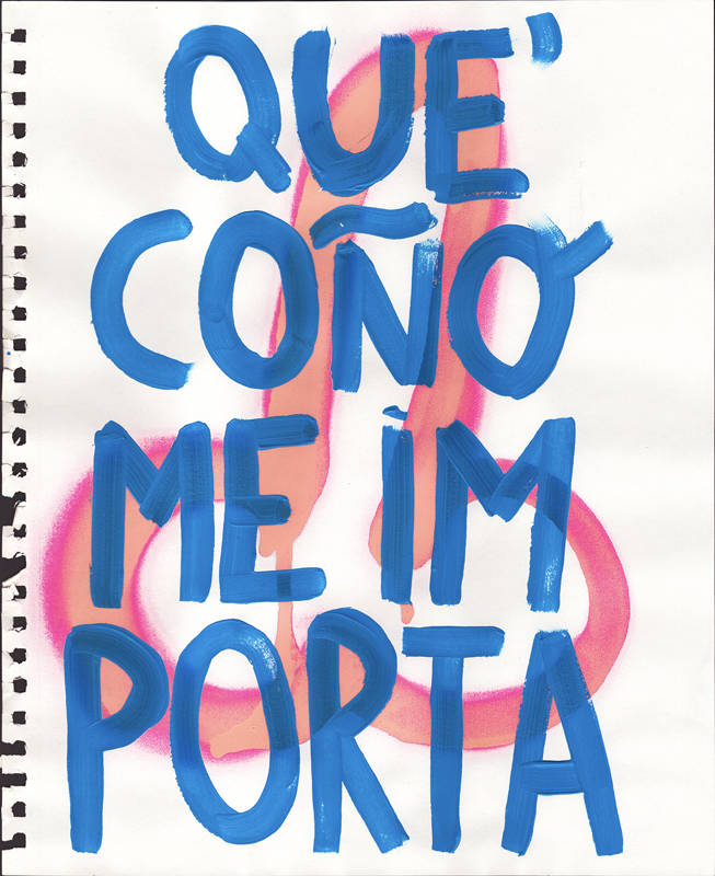 Technique mixte, composée de 108 pièces de différentes tailles (36 x 29 cm, 35 x 28 cm), réalisées sur papier avec de l’acrylique et de la peinture en aérosol. Les œuvres peuvent être adaptées à différents formats et supports, y compris des miroirs, des néons et des tissus.