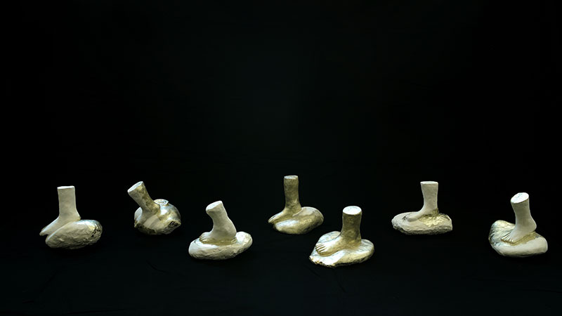 Le véritable objet du travail d’Alix Delmas n’est ni le geste ni le corps ni l’image mais à chaque fois et en particulier dans les petites sculptures qui précisément sont souvent sans contexte, le dehors. Et le seul dehors que nous connaissions est le paysage qu’il se résume à une flaque d’eau dans lequel un corps a disparu et dont il ne reste que les jambes ou qu’il ait été absenté pour laisser des pieds se lever, il est là. Il est là parce qu’il est le là ; l’absolu indépassable de l’expérience et le témoin indifférent de notre existence même.