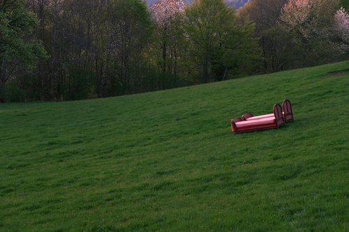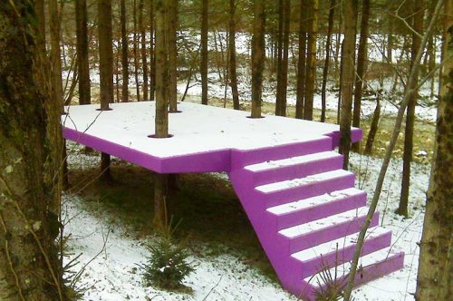 Les sculptures de grande taille mais de bâtiments en modèle réduit et qui flirtent avec le non-sens portent la même interrogation existentielle irrépressible que les images de mise en scène de son propre corps.