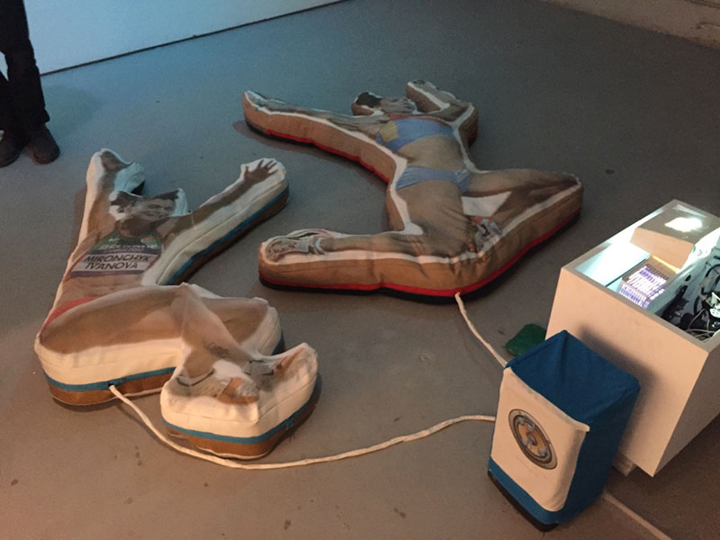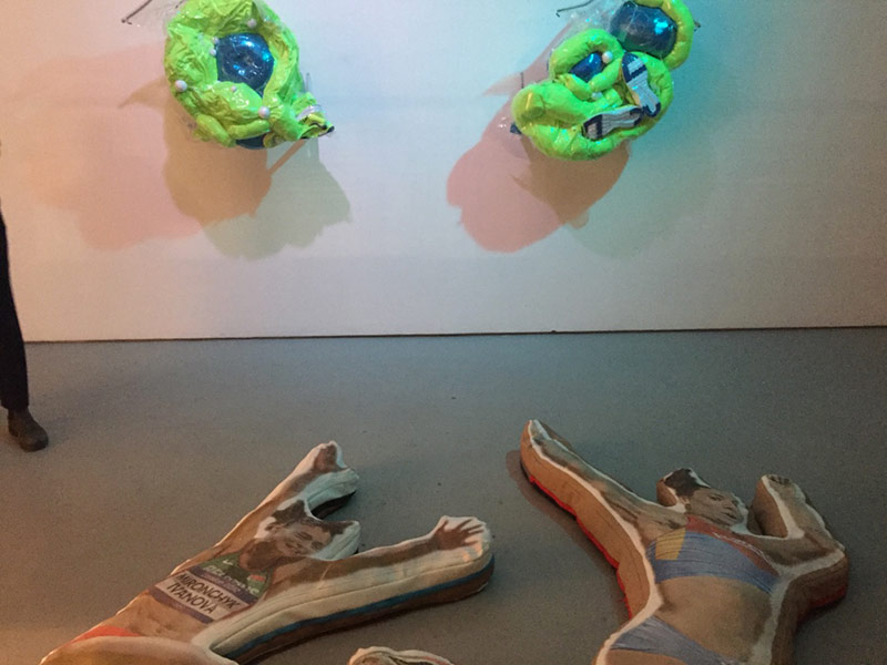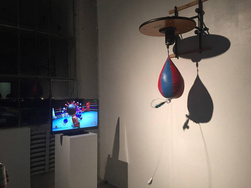 Play Dead, Hansen’s solo exhibition at Three Four Three Four gallery, run by artist Nick Fusaro, consists of a clumsy interactive video game, two body-shaped controllers for the game, a machine to automate a never-ending round of Nintendo’s Wii Boxing, and two sculptures. On the gallery floor, the game controllers consist of two images of female athletes printed on cushions shaped like the women’s bodies mid-flight. A screen is hung from the ceiling like a doorway to an uncanny virtual world. The game takes place in an astroturf-covered valley with sporting equipment and Sherman shepherds riding atop flying drones. Viewers must lie down on the cushions and look up at the ceiling to play the game. As the audience pushes down on the arms and legs of these cushions, the scene on the screen moves, the game is played. On the other side of the gallery, there is a monitor and a punching, or “speed” bag, which is connected to a Wii controller and mounted to a motor. On the monitor, a boxing game plays automatically as the punching bag and wiimote rotate together at regular intervals. Finally, on the wall, there are two sculptures that appear to take organic form. They are green fabric covered shapes, balls, and sneakers, pressed snugly into vacuum-sealed plastic bags.