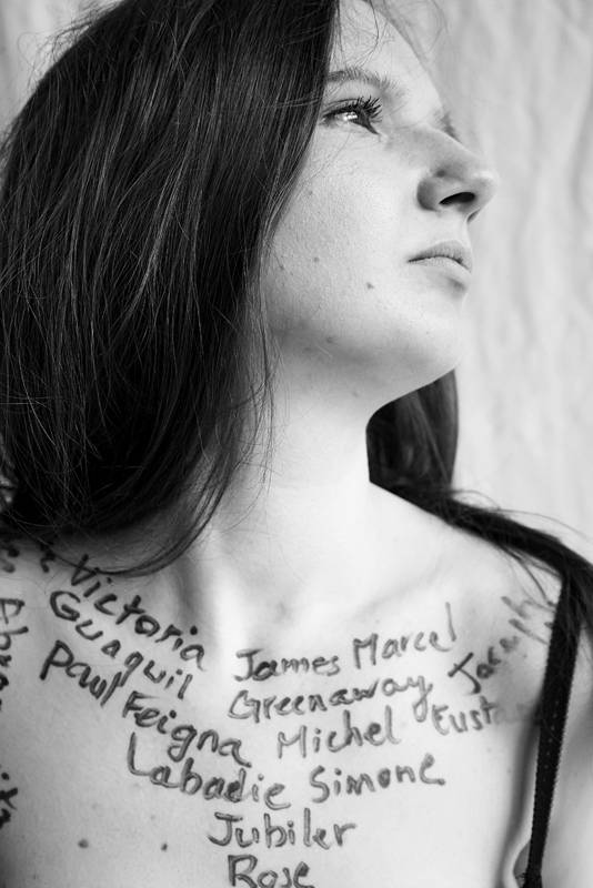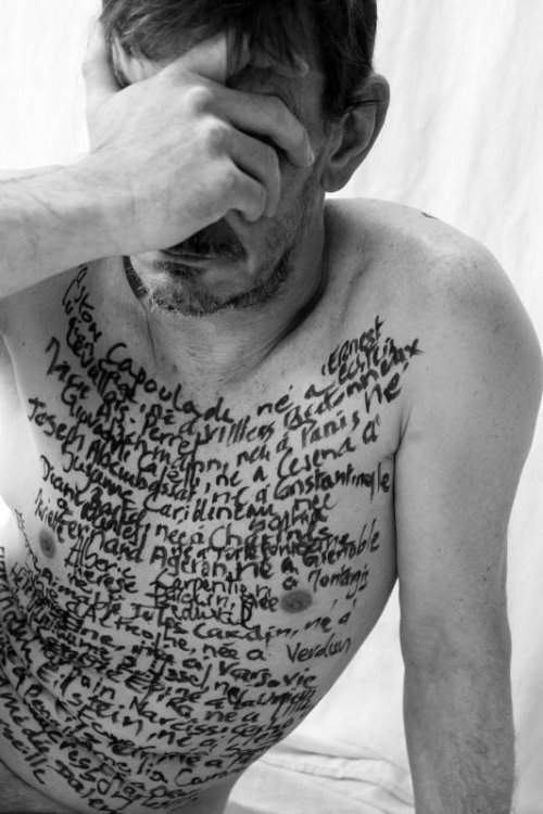 Ce projet se conçoit comme une série de photographies grand format, révélant des témoignages retranscrits sur des corps — parcellaires, fragmentés — conceptualisés comme des stèles vivantes. À travers eux, le corps devient support de mémoire, matière sensible et palpable, où le souvenir prend forme dans la chair.