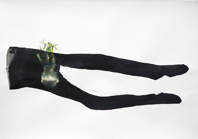 Ces deux premiers dessins de Manon Gignoux, l’un évoquant un collant avec fenouil, l’autre une jupe avec blette, appartiennent à la série Corps, ombres, légumes, réalisée au retour d’un séjour d’études au Japon.