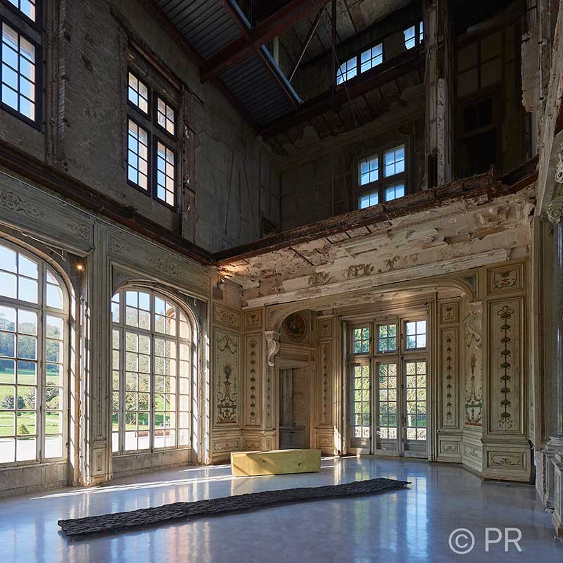 A la fin du parcours, dans la salle du château où sont dévoilées les traces du bombardement qui a marqué le bâtiment, Après Nature, au ras du sol, s’apparente à une mue. Marc Didou a également doré une poutre provenant du pin de Monterey abattu dans le parc suite à une tempête. Ce recouvrement, telle une réparation rappelle le décor fastueux du domaine.