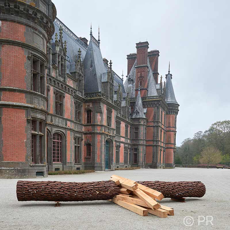 Chaque sculpture par son emplacement guide notre cheminement. L’installation Pipeline fossilis II composée de cinq éléments suggère une clairière. Elle fait référence aux alignements de pierres dressées en cercle tandis que les pierres sur lesquelles les pièces sculptées reposent font écho à celles du château.