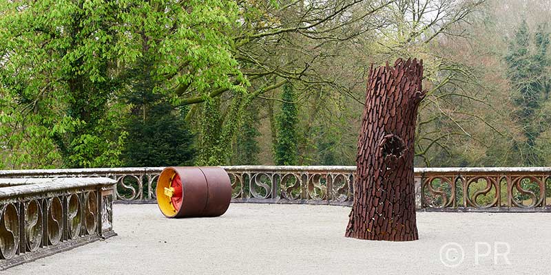 L’artiste a pris soin de nous amener à regarder différents endroits du domaine. Ses œuvres nous invitent à porter notre attention sur son architecture et sur son histoire. Il affirme vouloir « investir l’ensemble du parc de manière à ce que la pensée se déroule par stations successives, en harmonie avec le cheminement et le rythme d’un promeneur, de son temps et de l’espace qu’il traverse [1] ». Ses sculptures et installations nous conduisent étape par étape à contempler la diversité du décor du château, à s’interroger sur sa spécificité et à poursuivre une enquête, des fouilles.
