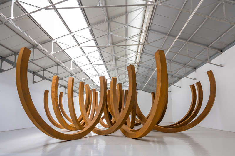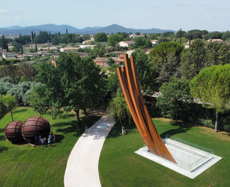 Ce qui saisit immédiatement dans les gigantesques parcs de sa Fondation, au Muy, dans le Var, c’est la monumentalité de ses œuvres. Tout comme celle des sculptures de ses amis, car l’artiste est aussi collectionneur. On y découvre ses créations en acier Corten que la rouille permet de dater, orange pour les plus récentes, plus sombres pour les plus anciennes. Elles sont issues de différentes séries : Points, Lignes, Lignes indéterminées, Angles, Arcs et Effondrements.