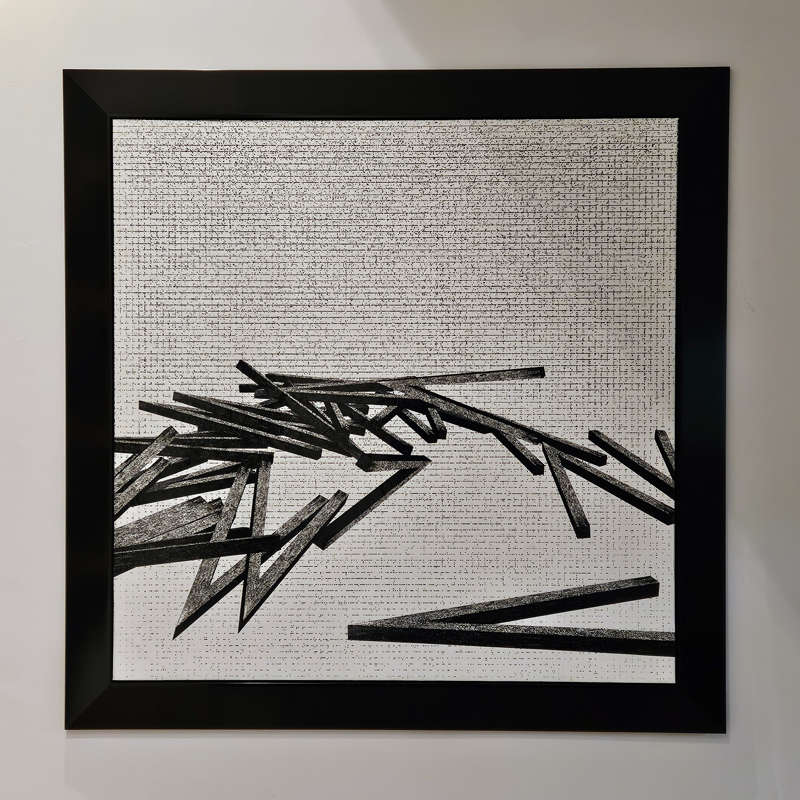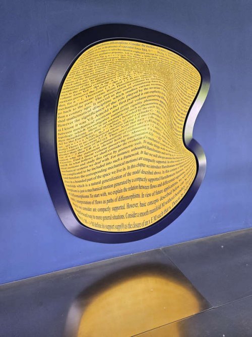 Il y a aussi l’usine où l’œuvre de Bernar Venet se poursuit, sans omettre les appartements qui ordinairement ne se visitent pas, mais où les pièces du maître de maison côtoient celles d’artistes majeurs des XXe et XXIe siècles. Cela permet de comprendre très précisément où Bernar Venet se situe artistiquement. C’est dans ce contexte que l’on découvre quelques créations récentes, parmi lesquelles des pièces de la série Difféomorphisme récemment présentée à la galerie Perrotin de Paris. Il s’agit de textes scientifiques portant sur des déformations de topologies qui, appliquées numériquement à ces mêmes textes, en complexifient davantage la lecture. Ces théories portent en elles les déformations dont l’artiste, littéralement, libère les énergies contenues. La mathématique omniprésente dans le travail de Bernar Venet est ici sous-jacente, tant aux théories qu’expriment les textes qu’aux algorithmes qui les déforment.