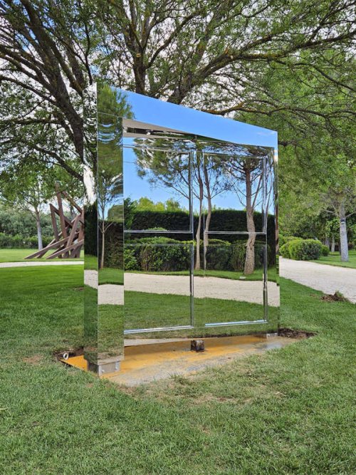 Cette année, c’est Jérôme Sans qui propose une exposition monographique au sein de l’espace de la galerie de la fondation. Il se souvient avoir été hébergé à New York par Bernar Venet tout comme ce dernier l’avait été auparavant par Arman dès son arrivée aux États-Unis. Le commissaire a choisi l’artiste Stefan Brüggemann dont l’exposition Inside Out est annoncée par une porte miroitante dès l’arrivée dans un des parcs de sculptures. Il s’agit d’une entrée qui s’ouvre sur l’espace extérieur au sein duquel elle est présentée. Au-delà de cette incongruité, l’extrême perfection de son revêtement en miroir l’intègre parfaitement à l’environnement qu’elle reflète si magnifiquement. Elle convoque ainsi le surréalisme dont la Belgique fête le centième anniversaire, un pays qui a su accueillir l’Arc Majeur, sur l’autoroute E411, l’une des œuvres emblématiques de Bernar Venet. Et force est de reconnaître que s’il est un sentiment qui l’emporte au Muy, c’est celui de l’étonnement face à tant créations qui, chacune, s’émancipe diversement du réel.