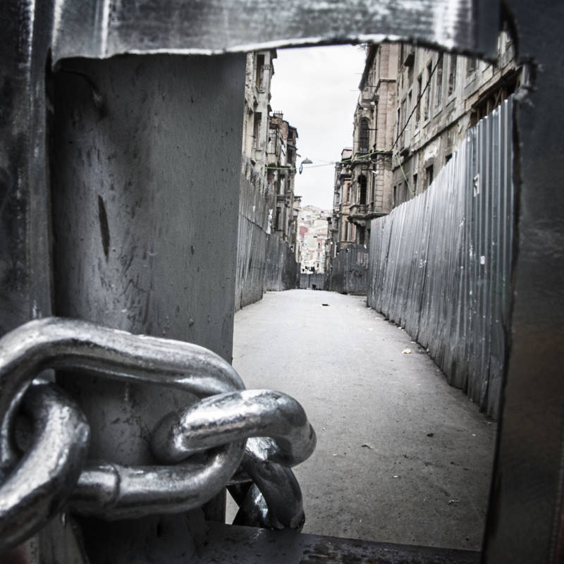 Tarlabaşı, une zone « définie par la négative [2] », « un territoire-piège » du transit et du provisoire, sous le projet de réveiller « la princesse empoisonnée d’Istanbul [3] » ; Tarlabaşı est tout cela et bien autre encore, une image, un mythe, « un état révolu de la ville [4] » où le marcheur se heurte en permanence aux grillages, aux barrières de tôles, aux rues et aux ilots barrés, qui en transforment le dédale en une succession de butoirs et de refuges pour les délaissés de la modernité, les blessés de la vie, les réfugiés de l’intérieur et ceux de l’extérieur installés dans la précarité ou en transit vers des horizons de paix. Tarlabaşı est un bruissement de langues où nul n’est étranger.