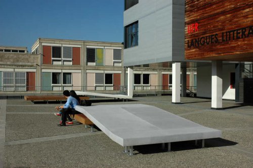 J’ai choisi d’intervenir sur le parvis en balcon. Potentiellement, cet espace conçu comme une dalle sèche exposée au vent, se présentant comme la proue d’un navire apparaissait comme un blanc sans qualité particulière. On voit bien sur l’image : un bâtiment de facture standard, un petit parvis qui s’avance en promontoire et sur lequel viennent se positionner les trois éléments conçus par mes soins. Plus précisément il s’agit trois volumes plans composés chacun de deux surfaces, l’une plate, l’autre brisée à deux reprises. On remarque aussi que les ouvrages sont en bois (du Massurunda) et en béton composite ; qualités peu discernables sur la photographie. Chaque volume est monté sur une structure en acier galvanisé que l’on le devine uniquement lorsque la hauteur de prise de vue est basse.