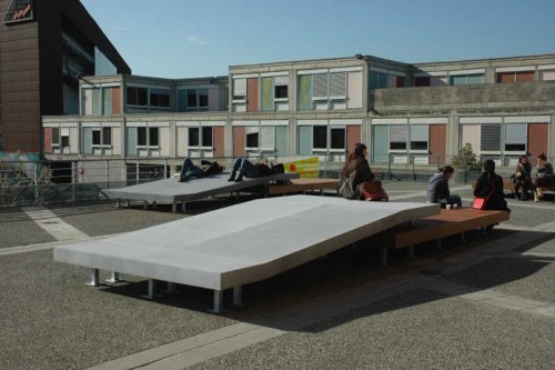 Les personnes figurant sur l’image donnent l’échelle, chaque pièce fait 730 cm par 240 cm, elles sont de proportions identiques. On voit aussi que les corps adoptent différentes postures, certains semblent traverser en marchant, d’autres y stationnent debout, certain assis, d’autres, enfin, semblent carrément affalés. L’ensemble se présente comme un mobilier urbain d’un genre particulier.