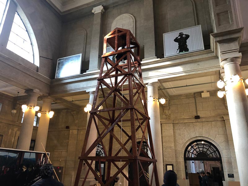 At the entrance, a large wooden watchtower first invites the viewers. Watchtowers are commonly found around the DMZ as the soldiers guard the border. They are symbols of security. However, inside the tower in the gallery, a metal bell is hung from the top. Artist Kyuchul Ahn created the bell made out of the melted metal from the demolished wire fences of the DMZ. The artist ringed the bell at the opening ceremony, wishing for a symbolic transformation of the metal from the military security to a peaceful and welcoming sound.