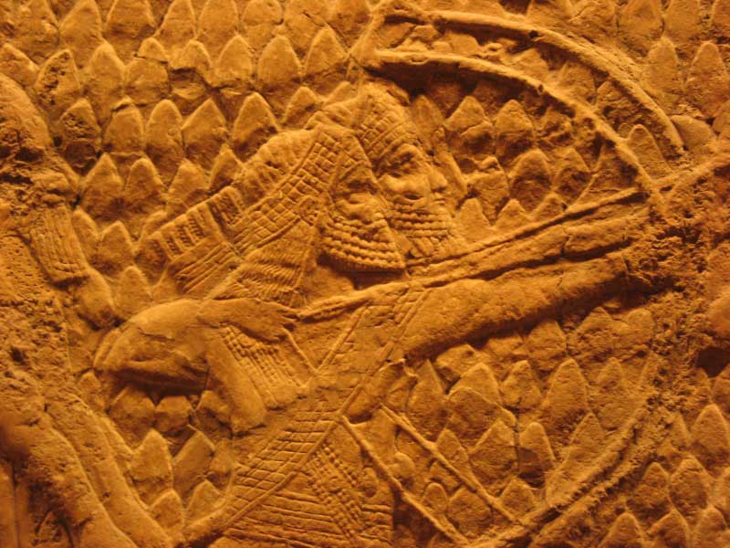 Quand le temps n’est pas à la guerre, le palais s’ornemente de fresques, l’arête du visage, tu le sais, fuit et flotte dès qu’il se présente de face, mais ce n’est pas la raison qui pousse au dessin du profil, dit Élie Faure, c’est l’incomparable conception de la masse et de la ligne évocatrice ; on aime ainsi le trait continu, c’est le trait qui enferme mais il protège aussi ; vois les cavaliers qui se suivent et cette chasse au lion, ne seront-elles pas des figures pour nos danses ?... Viens, dansons sur les pierres et le sable, j’écarte les bras comme le lion qu’on assomme et tu lèves le poing pour m’enfoncer le crâne ; ta robe te donne du maintien ; ici était l’entrée, tu reviens de la chasse, on ouvre la lourde porte et tu dois attendre qu’on la ferme avant d’ouvrir la suivante, jusqu’à douze portes de fer et de bois dur qui nous offrent un rythme pour nos figures répété jusqu’au fond du palais. Puis dans le silence des salles qui crissent sous nos pieds, le Sar énervé d’ennui se vautre dans les douceurs et scrute vainement aux regards des femmes et des eunuques le sens de ce qu’il fait ; alors il appelle ses chiens, on fait venir des esclaves qu’on promène tout nus et le Sar se distrait de voir souffrir les êtres. Il y prête la main, le sang sur sa peau calme sa mélancolie ; et si l’on donnait une fête, faites venir les musiciens et les danseurs ! Mais quels seront les cris qui calmeront son cœur ?... Et nous quelle est la danse qu’il nous faudrait jouer sous les tilleuls et les places ? Serait-ce celle des archers prisonniers du palais en route pour la bataille ou bien celle des déserts, des mules et des chiens au-dessus des palais enfouis ?
