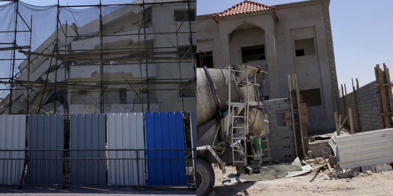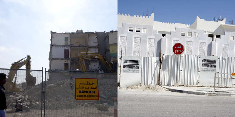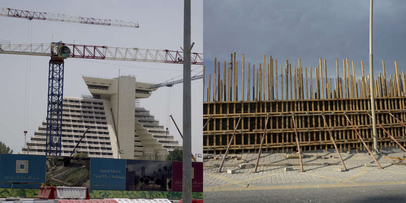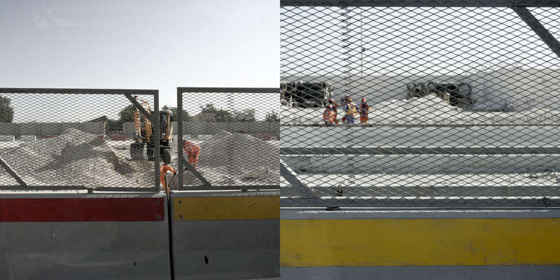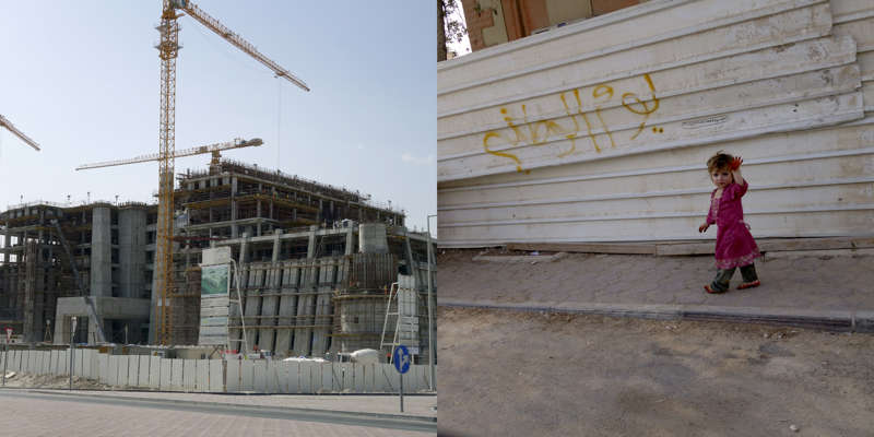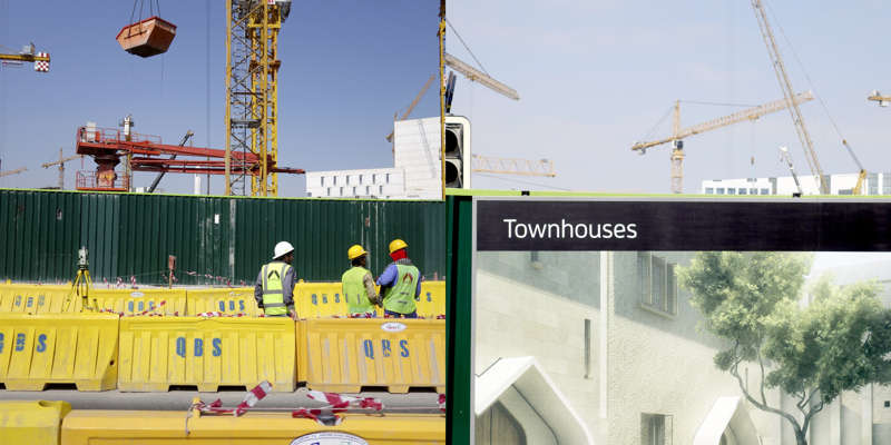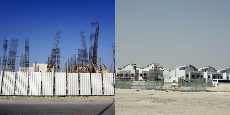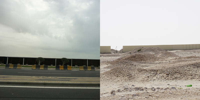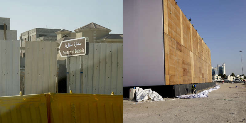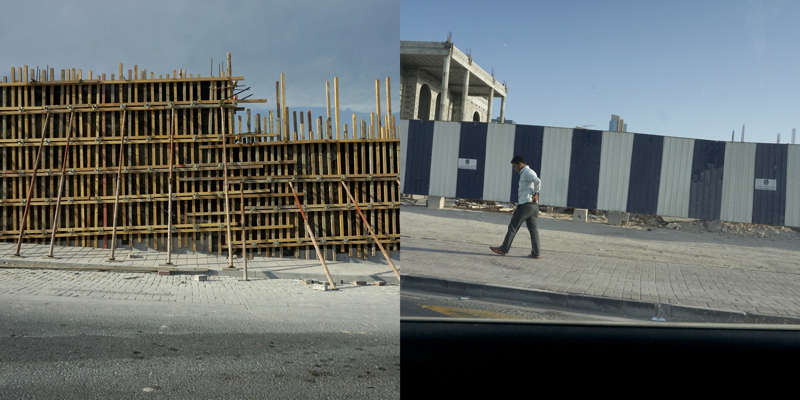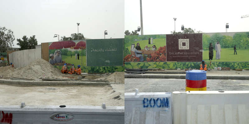Vue de la route, le dessin d’un état se lit dans ses murs. Ceux du Qatar, pays en construction, sont en grande partie provisoires. Ce sont des palissades, des petites falaises qui empêchent les accès, les passages, préservent des regards. Toutes sont temporaires, elles ont déjà disparu, ont été installées sur un autre chantier, ou mises au rebut. Elles sont signifiantes aussi, comme un langage elles parlent, elles signifient, elles peuvent être un support publicitaire ou même un élément politique.