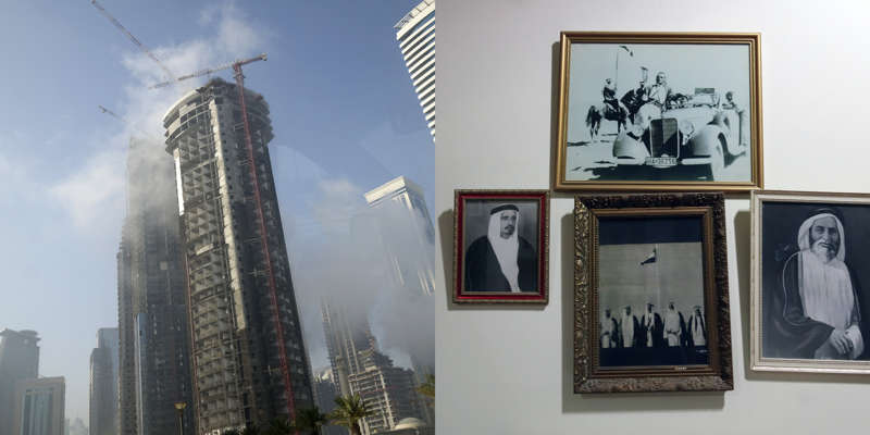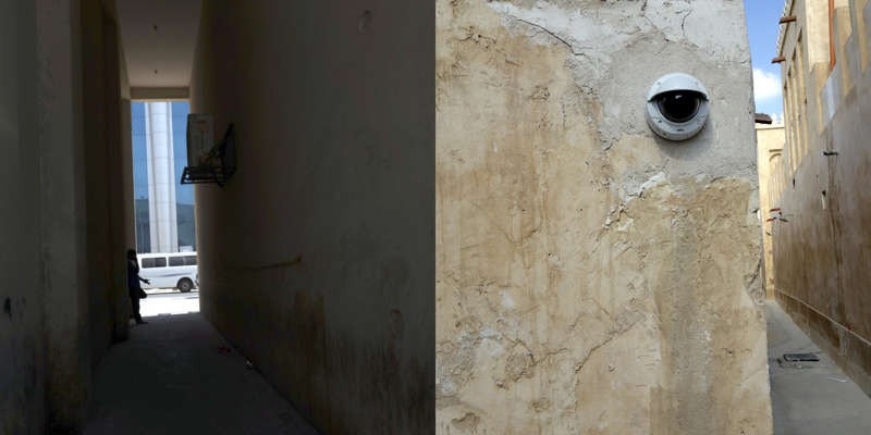Dans Un Grain est le récit en diptyque photographique, un collage, descriptif d’un monde central. Les protections contre certains éléments naturels, mais aussi contre les regards extérieurs ou étrangers, la distance, font parties du quotidien. Le sentiment nationaliste, dans un pays tout frais, est exacerbé, est nécessaire, pour exercer la cohésion d’une nation composée, remplie, à 90% d’expatriés, d’étrangers. Que ce soit dans la fête nationale, dans des coins de jardins privés, dans quelques traces, aujourd’hui disparues, de la construction en cours encore, dans des déchets de rues, dans des révérences et aussi, ou surtout, sur les premières pages des quotidiens, s’affichent les positions politiques.