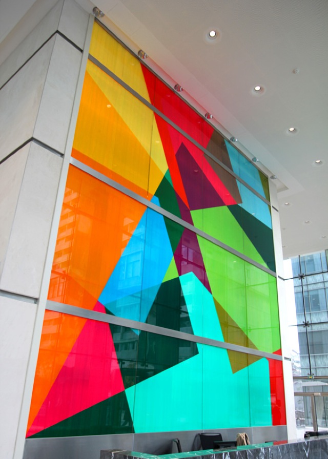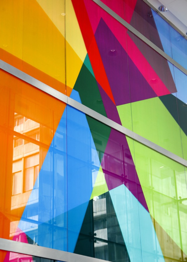 Cette (dé)construction colorée crée ainsi une passerelle visuelle d’un point à l’autre : du hall aux étages, de l’horizontale à la verticale, de la verticale à l’horizontale… Monumentale, fixée au mur, elle est en perpétuelle évolution, les couleurs en appelant sans cesse d’autres.