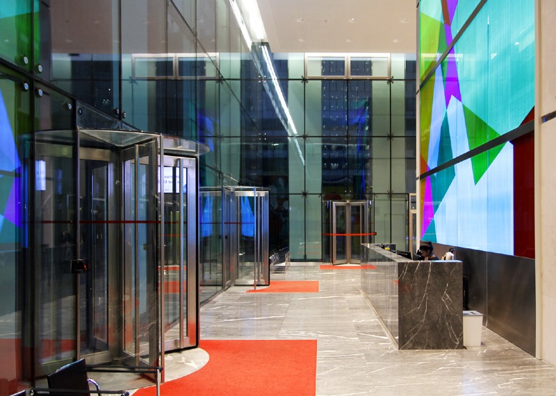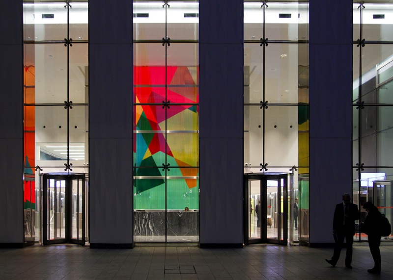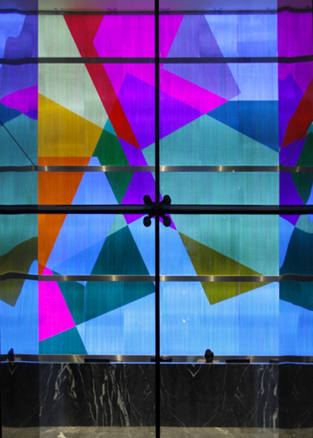 Nul besoin d’aller plus haut pour saisir l’esprit du lieu. L’objet de Mengzhi Zheng le contient tout entier dans la couleur, transformée en énergie. Ce résultat est rendu par une superposition de films appliqués sur du verre, en contact direct avec un tissu de fibres optiques équipé de LEDs programmés RVB. Ces additions et soustractions de tons dessinent une boucle régulière dans le temps, offrant à chaque instant du jour de nouveaux paysages sensoriels aux usagers et visiteurs.