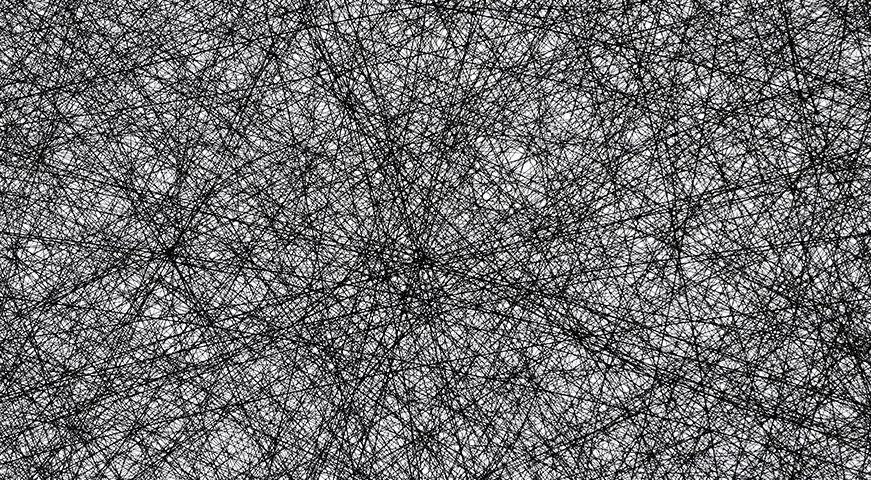 Dans sa Dissertation sur l’art combinatoire, Leibniz émet comme postulat « qu’il soit possible de prendre ensemble des choses aussi nombreuses qu’elles soient et de supposer le tout [comme] un [1] » avant d’envisager la variabilité telle « la quantité elle-même de toutes les variations [2] ». Ce sont des lignes qui s’assemblent par très grand nombre dans la série Géométries Irrationnelles de Pascal Dombis. Et peu importe la nature des supports dont les tailles varient de quelques dizaines de centimètres à quelques dizaines de mètres. Quand ces « formes abstraites » sont « subordonnées à des lois [3] », considérant la pensée du Beau d’Hegel, ou plus précisément à des algorithmes que l’artiste conçoit dans son atelier avant que des programmes ne les calculent sans se soucier des cadres que toutes, virtuellement, dépassent de leurs entrelacs. Et c’est peut-être pour reprendre la main sur ce qui lui échappe que l’artiste, usant d’un marteau et d’un burin, en altère les circonvolutions comme sur ses pièces en verre, dont il vient briser certaines couches. Soit une utilisation d’outils manuels qui lui permet de produire de nouveaux accidents, les craquelures des supports venant s’ajouter aux errances que le code autorise aux machines.