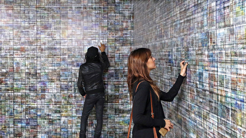 « Au début de ce siècle, une structure s’affirma progressivement, d’abord en France, puis en Russie et en Hollande. Elle est depuis restée dans le domaine des arts visuels l’emblème de l’ambition moderniste. Apparue dans la peinture cubiste d’avant-guerre pour devenir toujours plus rigoureuse et manifeste, la grille annonce, entre autres choses, la volonté de silence de l’art moderne, son hostilité envers la littérature, le récit et le discours [5] », nous dit Rosalind Krauss. De la grille, Pascal Dombis recherche les occurrences par l’image sur l’Internet pour les assembler par dizaines de milliers à même les murs des espaces qu’il investit avec son installation participative Mixed_Grill(e). Entrelacées toutes ensemble, elles forment une surface que le public, équipé de plaques lenticulaires, scrute afin d’en extraire de multiples lectures. La main, une fois encore, joue un rôle essentiel en survolant cette base de données murale dont le matériau lenticulaire nous renvoie aux premières expérimentations qu’Andy Warhol effectua à la fin des années soixante au sein de l’Art and Technology Program [6] initié par Maurice Tuchman au Los Angeles County Museum of Art. C’était une autre époque mais, déjà, les artistes s’emparaient des innovations technologiques de leur temps. La pratique de Pascal Dombis, s’articulant ici autour de l’appropriation des images, s’inscrit dans la continuité du mouvement pop art, mais à une ère post-Internet, et par conséquent délègue tout de ce qui relève du choix aux machines. Ses grilles ou trames sont algorithmiques, mais il en préserve la radicalité qu’il oppose ainsi au récit dans sa linéarité.