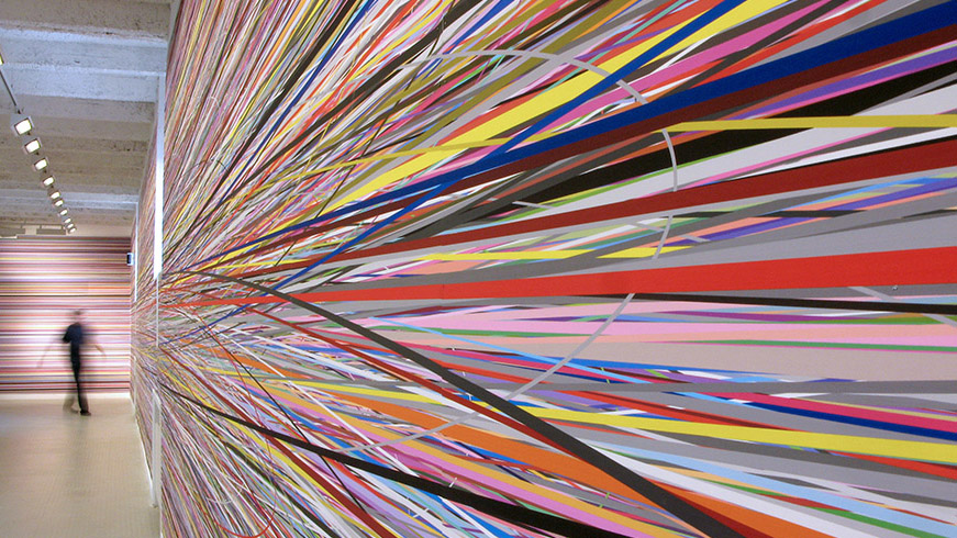 Les œuvres de l’artiste français vivant et travaillant à Paris Pascal Dombis résultent des combinaisons de myriades de lignes, d’images ou de textes. Et la variabilité propre aux éléments qu’il combine est déléguée à la computation d’algorithmes qu’il contrôle au travers de machines.