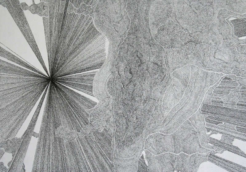 Dans certains dessins de Nicolas Aiello, les lignes sont faites de lettres, d’emprunts de textes. Des lettres qu’il est dur de distinguer les unes des autres, des lettres qui se retirent de leur source, de leur sens. D’habitude, les lettres projettent les humains dans des idées sous-marines ou aériennes, des idées qui font les grands huit avec la terre ferme. Les pensées des textes écrits se calfeutrent dorénavant au creux des lignes, ou bien du titre des œuvres de Nicolas Aiello. Syntagmes sans boussole, les lettres font ici leur retour au papier. Nicolas leur crée des chemins en rayons, leur aiguille un réseau. Il programme un voyage lent, il y casse ses yeux, les tendons de sa main.